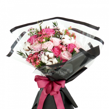 - rose, bunga cotton, dianthus, calimero, dan parvifolia, dirangkai dengan wrapping hitam dan pita ungu
